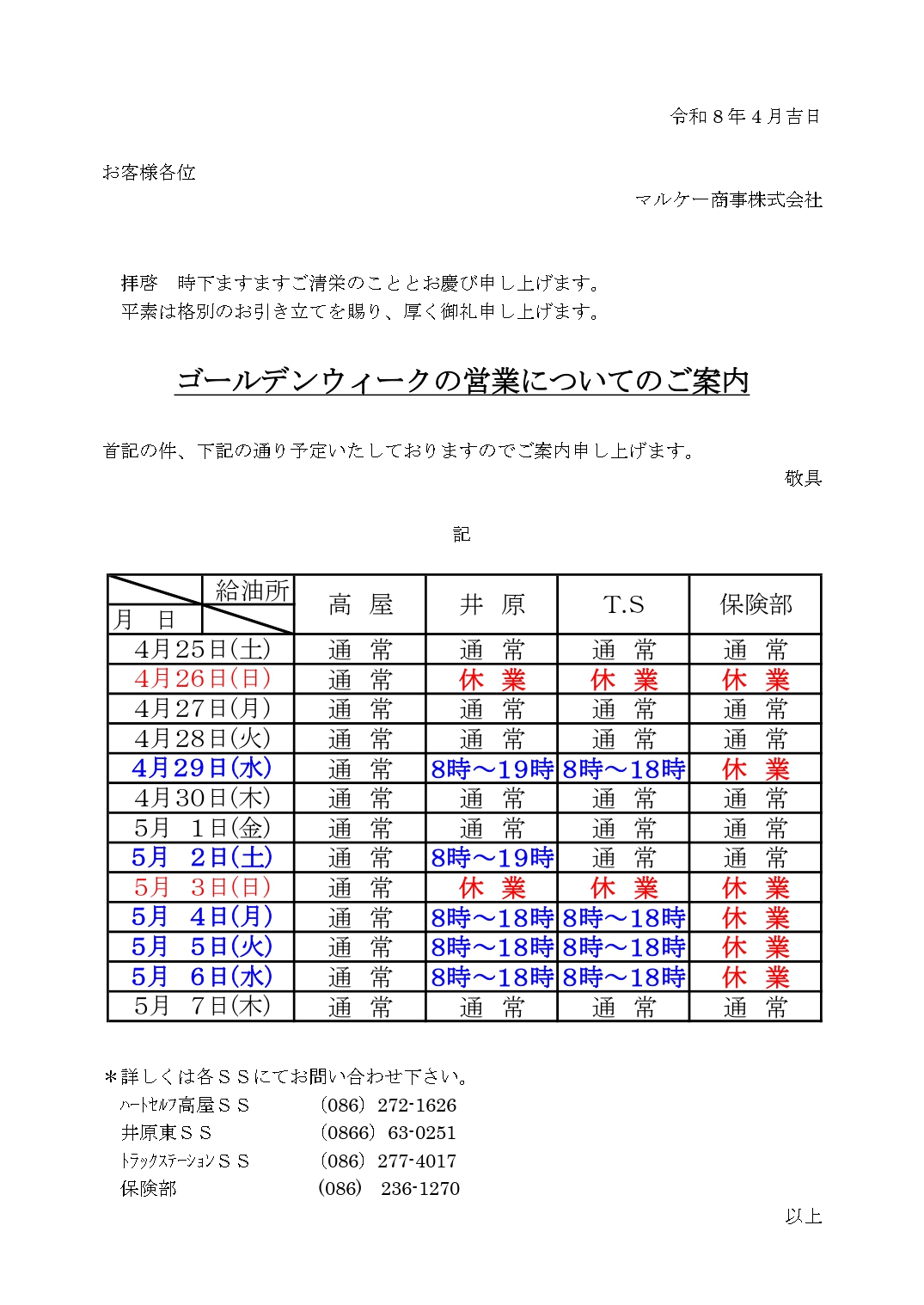 GW営業案内のお知らせ